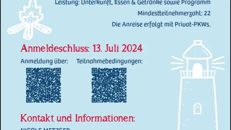 Es freuen sich auf eine erlebnisreiche Zeit: Lukas von Nordheim (Pfarrer in Bensheim-Auerbach), Daniel Fritz (Pfarrer in Zotzenbach) und Nicole Metzger (Referentin für Familienbildung, ev. Dekanat Bergstraße) Mindestteilnehmerzahl: 22. Preise: Erwachsene: 80€, Kind: 60€ (ab dem 2. Kind 50€), inkl. Unterkunft, Essen, Getränke und Programm Anmeldungen bis zum 13. Juli 2024 (über QR-Code oder direkt an Nicole Metzger)