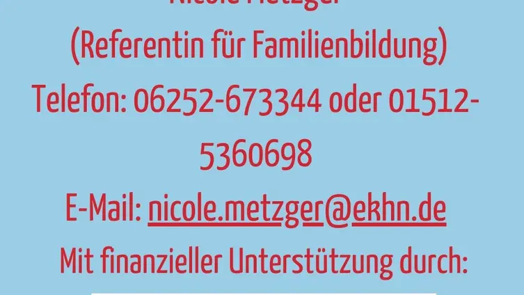 Informationen und Kontakt: Nicole Metzger (Referentin für Familienbildung, ev. Dekanat Bergstraße) Telefon: 06252-673344 oder 01512-5360698 E-Mail: nicole.metzger@ekhn.de