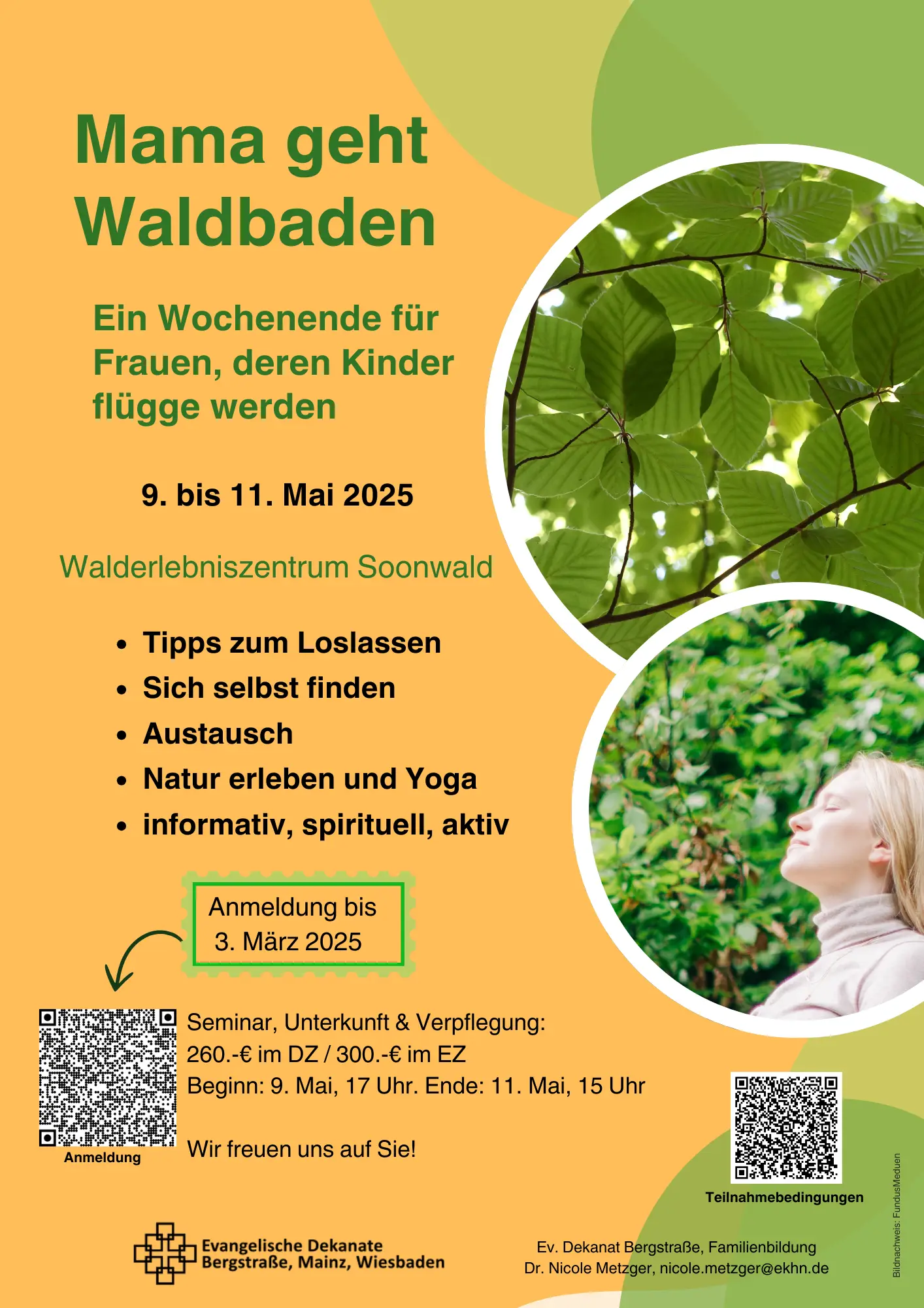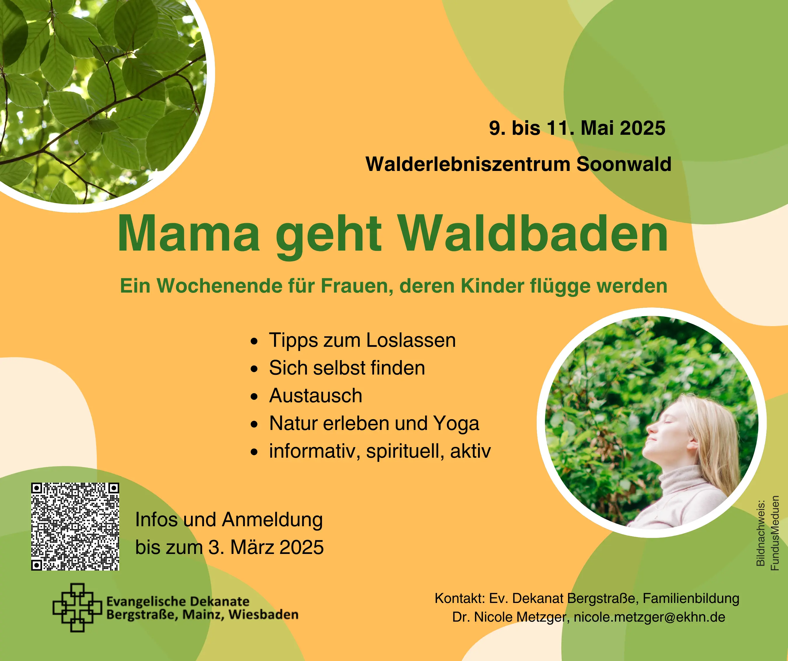 Ein Wald-Wochenende im Soonwald vom 9. bis 11. Mai für Frauen, deren Kinder flügge werdenDer Auszug der Kinder verändert das Leben von Eltern radikal. Wer Lust hat, mit Gleichgesinnten den Übergang in die „Empty-Nest-Phase“ bewusst zu gestalten, kann sich bis 3. März anmelden: Bewegung, Entspannung in der Natur und fachlicher Input wechseln sich an diesem Wochenende ab.An diesem Wochenende ist Zeit, um die Veränderungen, die die „Empty-Nest-Phase“ mit sich bringt, bewusst wahrzunehmen und zu gestalten: Dr. Nicole Metzger, Referentin für Familien-/Bildung des Dekanats Bergstraße, und ihre Kolleginnen Miriam Heil und Dr. Susanne Claußen (Bildungsreferentinnen in den Dekanaten Mainz und Wiesbaden) geben Tipps zum Loslassen und sich selbst finden und sie ermuntern dazu, neue Freiräume zu entdecken und kreativ zu gestalten.Überdies besteht die Möglichkeit zum Austausch mit Gleichgesinnten und zum Naturerleben durch Bewegung im Wald und christliches Yoga. Seminareinheiten und fachlicher Input wechseln sich mit kreativen und Bewegungselementen in der Natur ab. Daneben werden - wenn gewünscht - spirituelle Impulse angeboten.Der Workshop beginnt am Freitag, 9. Mai, um 17 Uhr und endet am Sonntag, 11. Mai, gegen 14 Uhr. Veranstaltungsort ist das Walderlebniszentrum Soonwald Neupfalz in 55444 Schöneberg. Die Kosten für Kursgebühr, Übernachtungen und Vollpension betragen 300 Euro im Einzelzimmer und 260 Euro im Doppelzimmer. Die Teilnehmerinnenzahl ist begrenzt, der Workshop kommt erst ab einer Zahl von 15 Frauen zustande. Link zur AnmeldungKontakt: Nicole Metzger, Telefon: 06252/6733-39 oder 01512/5360698, E-Mail: nicole.metzger(at)ekhn.de