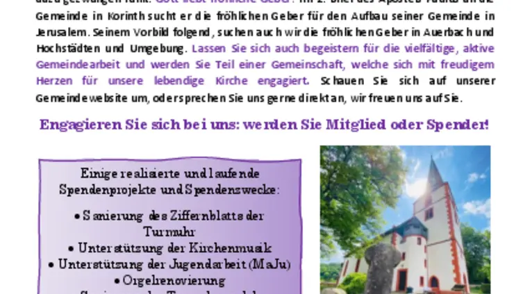 Im zweiten Brief des Apostels Paulus an die Gemeinde in Korinth sucht er die fröhlichen Geber für den schwierigen Aufbau seiner Gemeinde in Jerusalem. Seinem Vorbild folgend halten wir auch heute wieder Ausschau nach den fröhlichen Gebern. Also nach Ihnen!?
