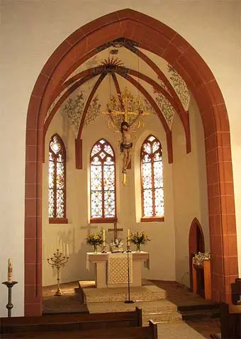 Chor besteht aus zwei kreuzgratgewölbten Jochbogen. Das Gewölbe zeigt eine rankenartige Ausmalung.