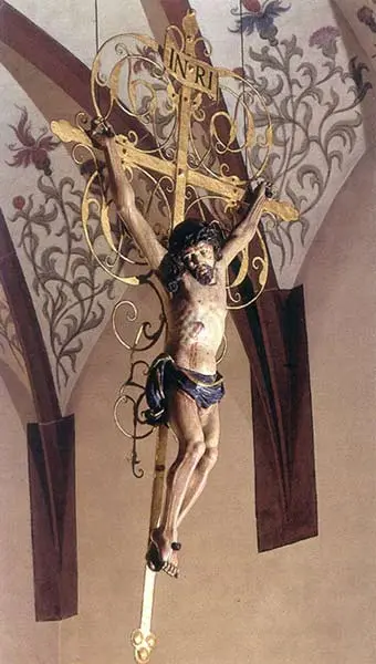 Es wurde 1684 von einem Gemeindemitglied gestiftet. Das vergoldete Eisenkreuz mit schmückenden Renaissanceformen unterlegt den hölzernen Corpus Christi wie ein Heiligenschein. Die Kombination der Werkstoffe Holz und Schmiedeeisen ist selten zu sehen.